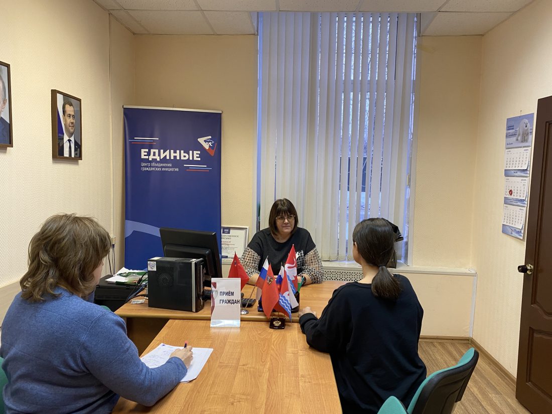 Депутат Совета депутатов г.о. Долгопрудный Елена Ким провела приём населения в Центре объединений гражданских инициатив «Единые», работающего на базе Общественной приёмной партии «Единая Россия». Внеочередная встреча состоялась в связи с большим количеством обращений, поступающих в Центр. Также в диалоге с гражданами приняла участие руководитель Общественной приёмной Наталья Гулина.