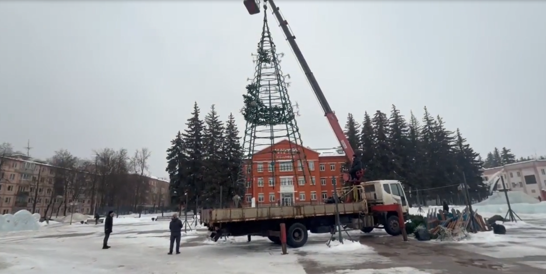 14 февраля на площади Собина начался демонтаж новогодних украшений — рабочие разбирают ёлку.