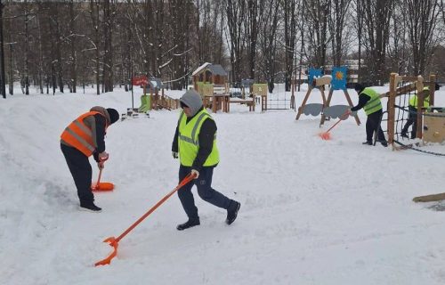 12 рабочих, как обычно, трудятся с 7 утра, чтобы освободить для прохода жителей лестницы, спуски, пешеходные дорожки. А в Центральном парке началась уборка снега на детских и спортивных площадках, чтоб юные горожане могли провести последние дни школьных каникул, лазая по своим любимым каруселям и лесенкам.