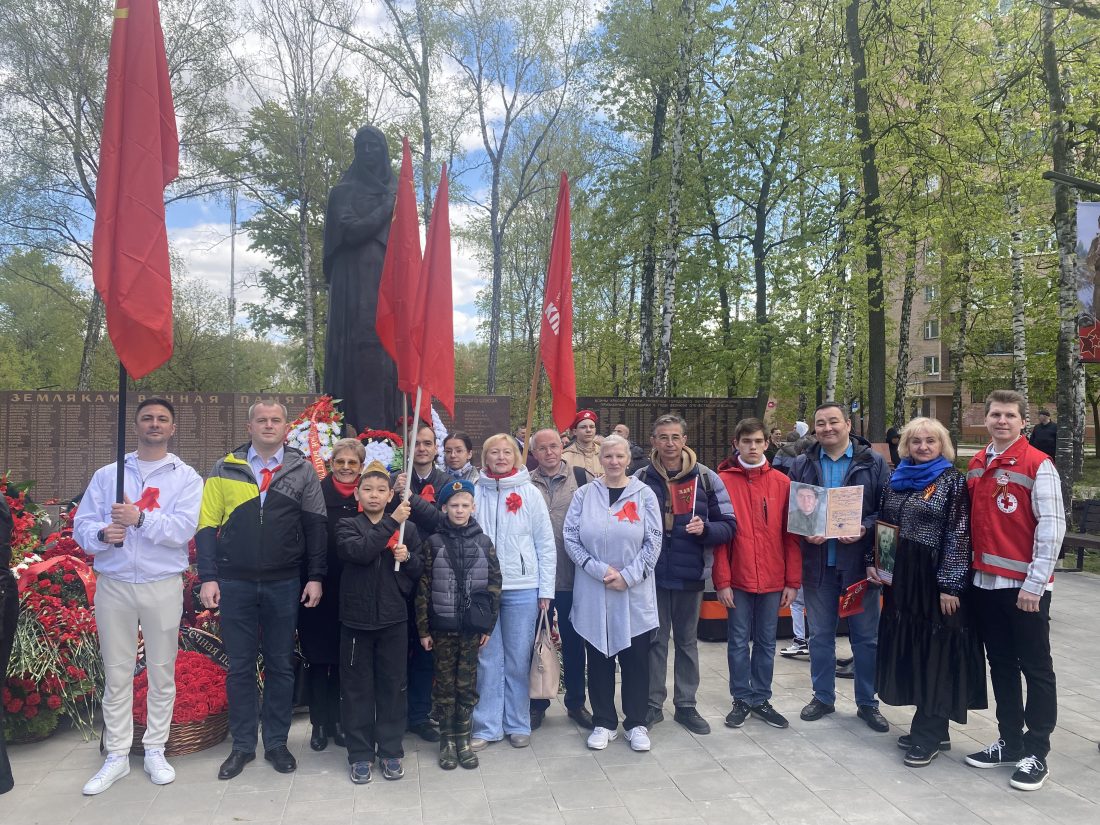 С победными Красными Знаменами коммунисты прошествовали по городу и возложили цветы к памятнику «Скорбящая Мать» в память о погибших долгопрудненцах, а затем провели автопробег и возложили венок к Памятнику павшим воинам в микрорайоне Хлебниково.