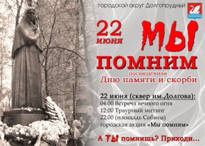 В День памяти и скорби в Долгопрудном пройдут патриотические мероприятия. Мы вновь будем вспоминать тех, кто ценой жизни защитил Отчизну. Тех, кто трудился на благо Победы. Тех, кто стал жертвой самой кровопролитной и страшной войны в истории нашей страны.