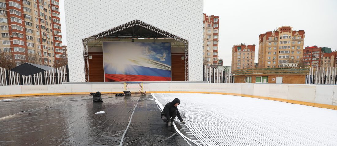 Сейчас рабочие укладывают на специальную подложку айс-маты. А это, как сообщил руководитель Объединённой дирекции парков Долгопрудного Сергей Пятковский, без малого 25 километров полипропиленовой трубы. По ней будет циркулировать хладагент, обеспечивая твёрдый и ровный лёд даже при температуре +5 градусов Цельсия.