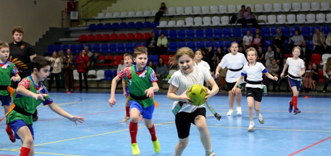 Порядка сотни начинающих спортсменов от 5 до 9 лет собрались в зале «Салюта», чтобы попробовать свои силы в состязаниях по тэг-регби – бесконтактной игре, где вместо применения силовых захватов участники отрывают от формы соперников специальные ленты.