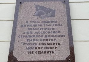 Долгопрудненцы также приняли участие в битве под Москвой. На стене ДК «Вперёд» находится мемориальная доска, установленная в 1966 году. На ней написано, что в этом здании 28 ноября 1941 года коммунисты 2-ой Московской стрелковой дивизии дали клятву: «Стоять насмерть. Москву врагу не сдавать!»