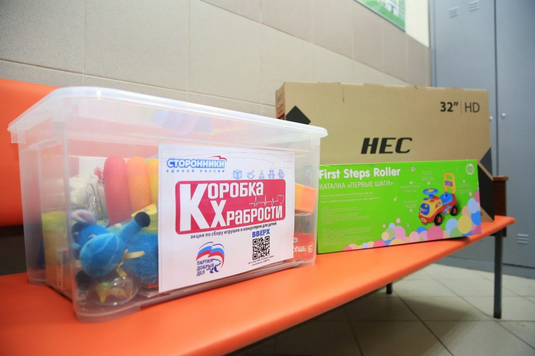 Пополнить «Коробку храбрости» можно игрушками, канцелярскими принадлежностями, книгами, раскрасками и игровыми наборами. Все предметы должны быть новые, в товарной упаковке. Не принимаются мягкие игрушки, бьющиеся предметы, детская косметика.