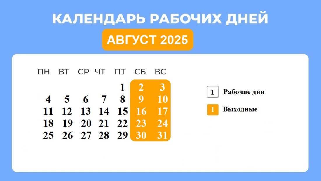 В августе 2025-го у работающих по пятидневному графику будет 21 рабочий день, 10 выходных (2, 3, 9, 10, 16, 17, 23, 24, 30, 31 августа).