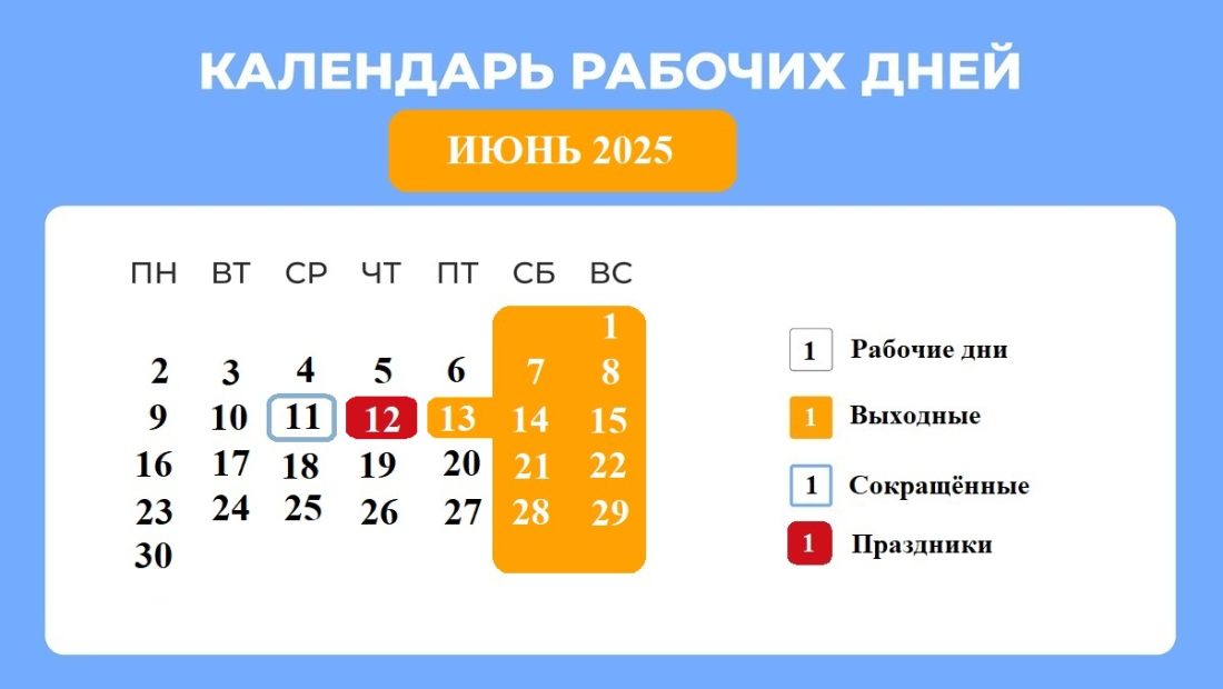 Всего в июне 2025 года из 30 календарных дней — 19 рабочих дней и 11 нерабочих дней. Помимо стандартных суббот и воскресений, дополнительный отдых появится благодаря праздничному дню — 12 июня. Один из нерабочих дней — 13 июня, пятница станет выходным благодаря переносу выходного с 8 марта, выпавшего в 2025 году на субботу. Таким образом в июне 2025 году выходными при стандартной пятидневной рабочей неделе станут 1, 7, 8, 12, 13, 14, 15, 21, 22, 28 и 29 июня.