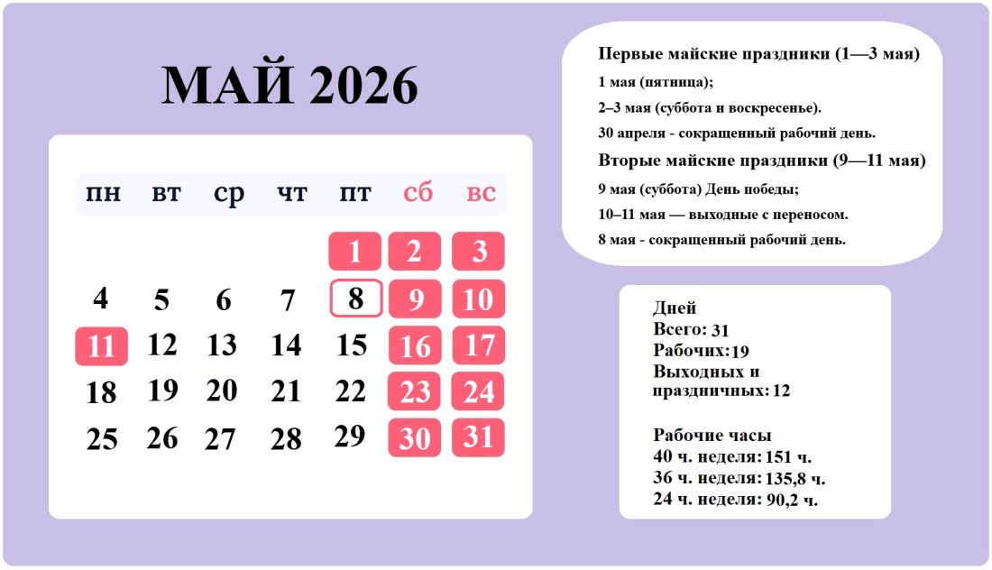 В мае 2026 году будут длинные выходные, два сокращенных рабочих дня и одна полноценная рабочая неделя между праздниками.