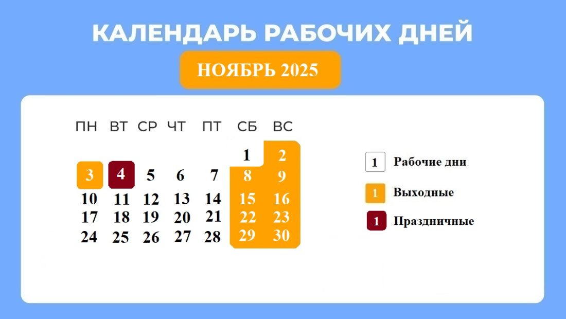 В ноябре 2025 года запланировано 30 календарных дней, из них 19 рабочих и 11 выходных и праздничных: 2, 3, 4, 8, 9, 15, 16, 22, 23, 29 и 30 ноября. 1 ноября, в 2025 году объявлена рабочим днем, а выходной переносится на понедельник, 3 ноября, такое решение принято, чтобы получились три непрерывных дня отдыха — с 2 по 4 ноября, включая государственный праздник День народного единства (4 ноября).