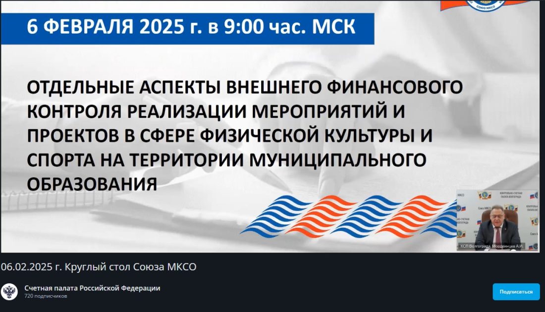 Работники Контрольно-счетной палаты городского округа Долгопрудный 6 февраля 2025 года приняли участие в круглом столе Союза муниципальных контрольно-счетных органов на тему: «Отдельные аспекты внешнего финансового контроля реализации мероприятий и проектов в сфере физической культуры и спорта на территории муниципального образования».
